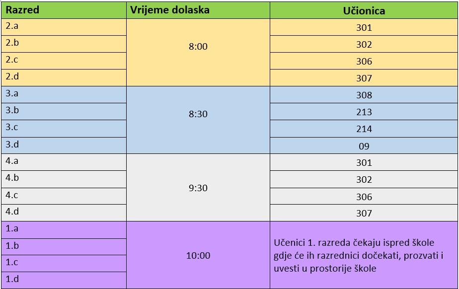 Raspored dolazaka po razredima možete vidjeti na slici dolje.