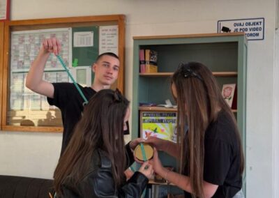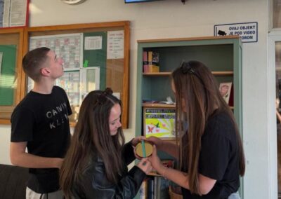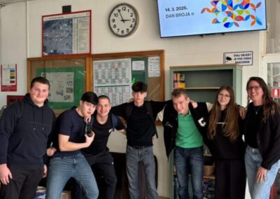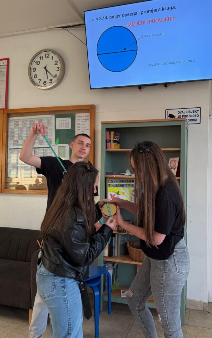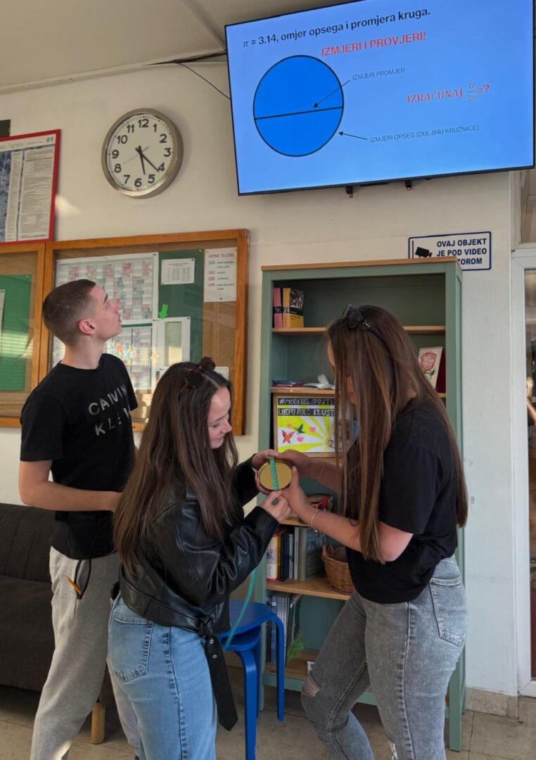 U našoj smo ga školi proslavili raznim aktivnostima za učenike. U kutku za animiranje, učenje i čilanje, tzv. K.A.U.Č. kutak, učenici su rješavali razne matematičke mozgalice, vježbajući vizualnu percepciju i razmišljanje izvan okvira. Mjerili su duljinu opsega kružnog predmeta i njegov promjer te dijeljenjem tih veličina provjeravali vrijednost broja pi. Održano je i natjecanje u pamćenju decimala broja pi među maturantima. Pobjedu je odnijela učenica Ramona Šinogl zapamtivši 101 decimalu. Drugoplasirani Petar Šafar zapamtio je 72 decimale, a treće mjesto su dijelili učenici Mislav Bihar i Jona Pesserl sa 65 decimala. Čestitke svim učenicima koji su sudjelovali. Aktivnosti su pripremile profesorice matematike Adnana Peštalić i Božica Šebek.